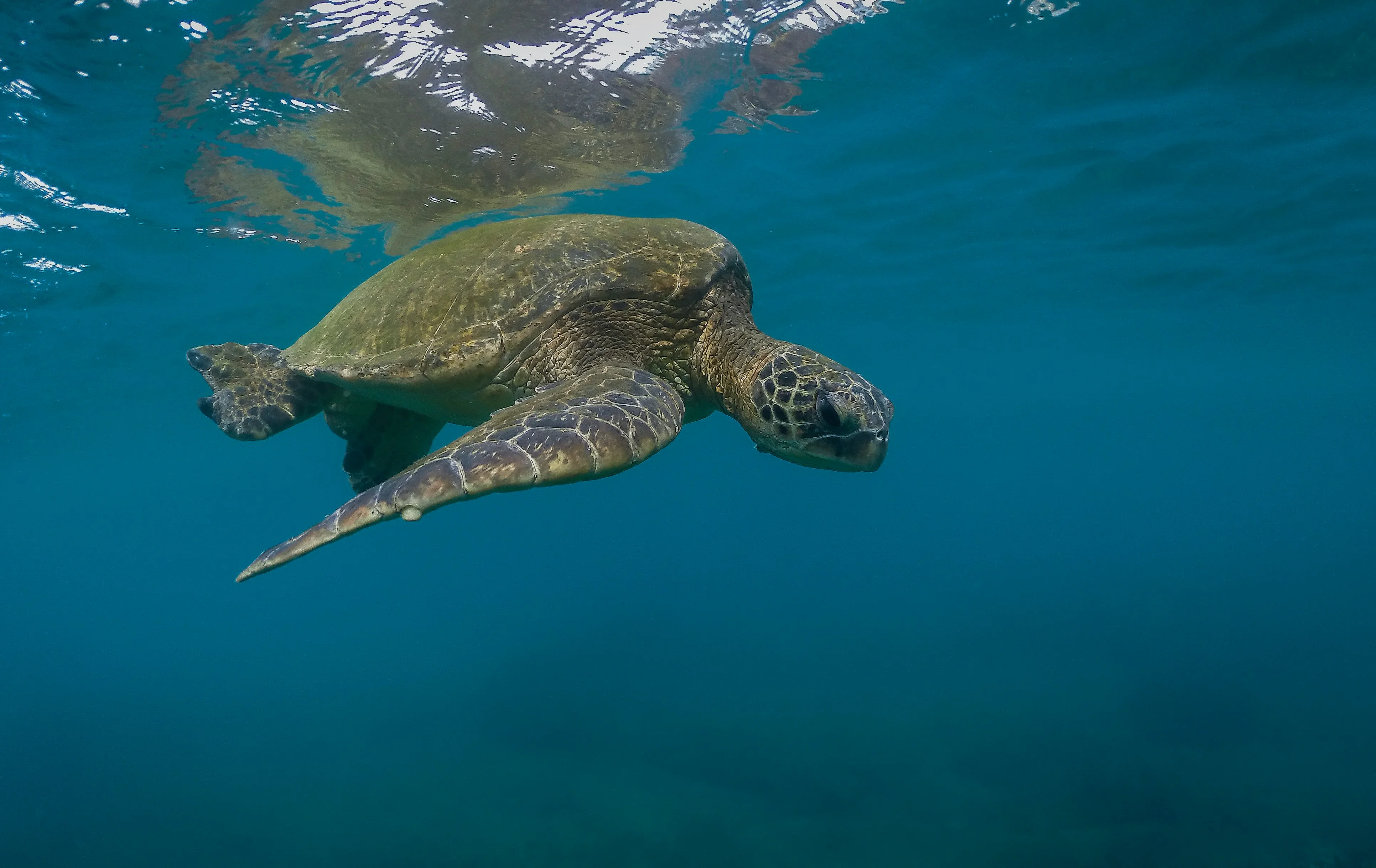 A large, gentle sea turtle often seen cruising reefs and grazing seagrass meadows. Adults are mostly herbivorous and spend long periods foraging in shallow coastal waters before surfacing calmly to breathe.